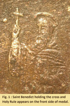 The front of the medal depicts Saint Benedict holding a cross in his right hand (Figure 1&2). In his otherhand he holds the Benedictine Rule, a guideline written by the Saint for monastic life and discipline (Sutera 1997:2). On either side of Benedict are a raven and a cup. Both symbols represent periods in Benedict's life when he was saved by his faith. The central image is surrounded by the inscription CRUX S.P. BENEDICTI, which stands for Crux Sancti Patris Benedicti, the "Cross of the Holy Father Benedict" (Gueranger 1880:11).