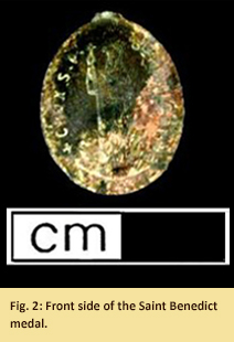 This type of Saint Benedict medal is commonly referred to as an ordinary medal (Herbermann 1913:338). This particular medal is an oval shape approximately 1.6 cm by 1.2 cm. A medal this small would probably have been worn on a rosary instead of individually.